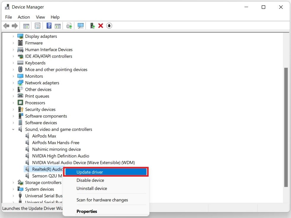 Per iniziare, apri il menu Start e cercaGestore dispositiviper aprirlo. Nella finestra, espandiController audio, video e giochi. Dalle opzioni espanse, fare clic con il pulsante destro del mouseAudio ad alta definizione Realteke selezionaAggiorna driver.