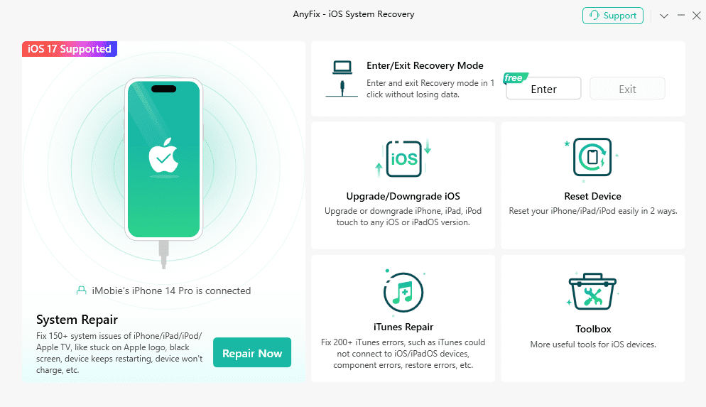כלי תיקון המאפשר לך לתקן את האייפון שנתקע במצב התאוששות. חוץ מזה, AnyFix תומך בתיקון 150+