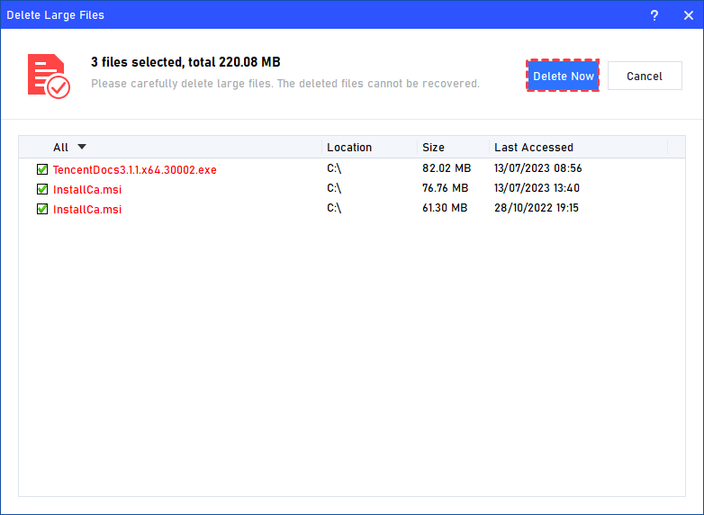 כדי להתמודד עם החשש הזה, שקול לשדרג למהדורת IEMOA Partition Assistant Professional ושימוש בפונקציית Delete Large Files. תכונה זו סורקת בצורה חכמה את הכוננים שלך, ומפרטת קבצים גדולים מ-16MB. חלק מהקבצים מסומנים באדום, הדורשים טיפול זהיר. הסר אותם בקלות על ידי לחיצה על "מחק עכשיו" כפתור.