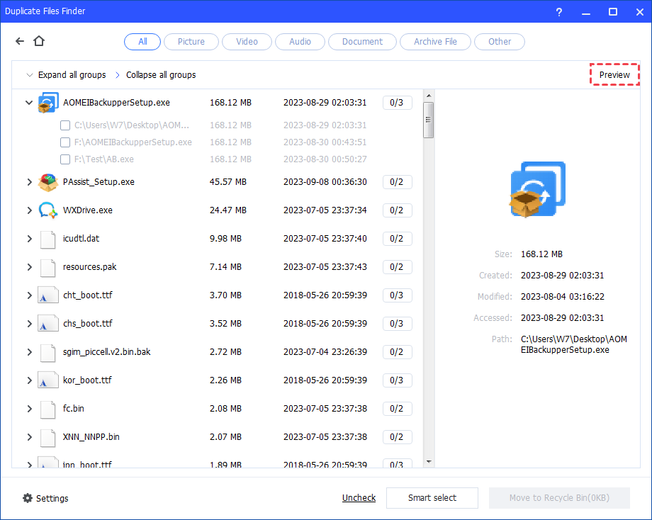 שלב 3. לאחר השלמת התהליך, יוצגו כל הקבצים הכפולים העומדים בקריטריונים שקבעת. אתה יכול לעיין בקבצים כפולים אלה על ידי לחיצה על "תצוגה מקדימה" כפתור.