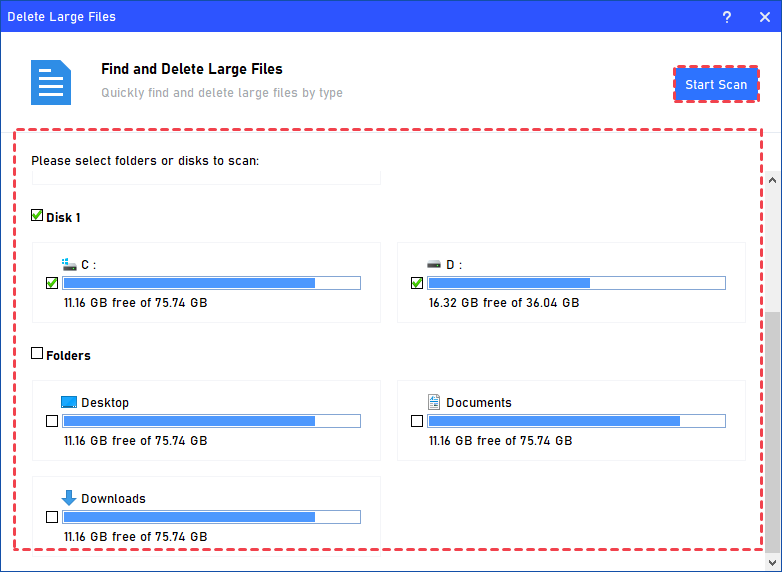 פֶּתֶק:כברירת מחדל, רק דיסק המערכת נבחר. אם תנסה להתחיל את הסריקה מבלי לבחור מחיצה כלשהי ותקבל את ההודעה "אנא סמן את התיקיה או המחיצה שיש לסרוק ונסה שוב“.