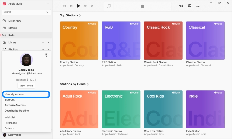 שלב 1.ב-iTunes, לחץחשבון > הצג את החשבון שלימסרגל התפריטים.