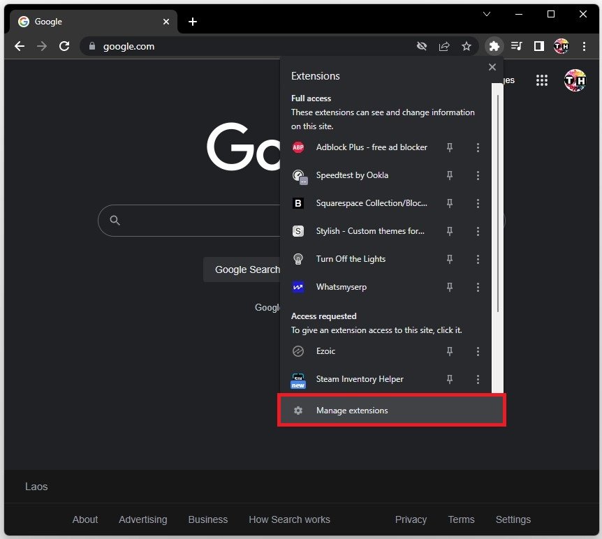 אם התקנת בעבר הרחבת דפדפן חדשה, היא עלולה לגרום לבעיות רשת ולגרום לשגיאת החיבור אינה פרטית שאתה מקבל. בדפדפן Chrome שלך, לחץ על סמל התוסף ובחרניהול הרחבות.