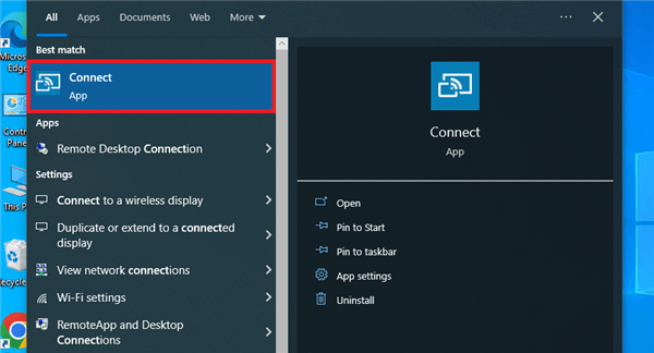 שלב 1:הקלד Connect בחיפוש Windows ובחר באפליקציית Connect המוצגת בתמונה למטה.