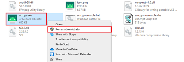שלב 5.עבור לתיקיה שבה הורדת את קובץ Scrcpy, לחץ באמצעות לחצן העכבר הימני על Scrcpy.exe ובחר הפעל כמנהל.