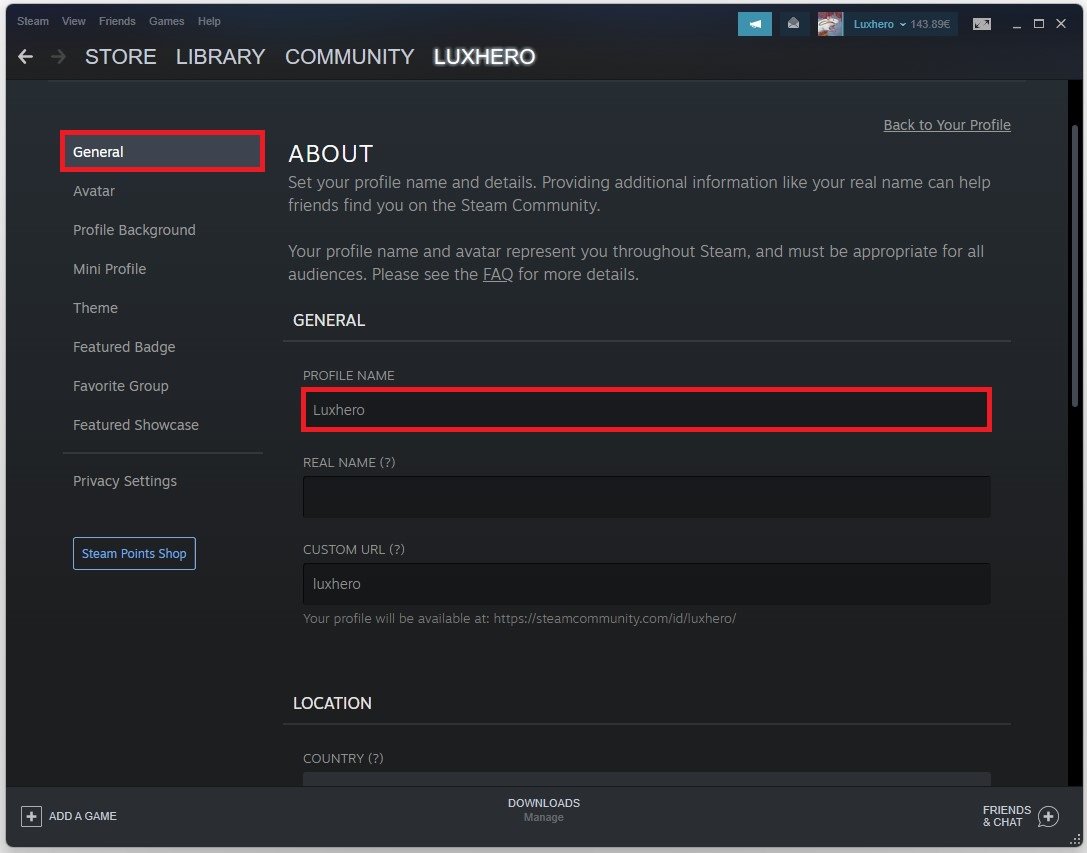 בהגדרות הפרופיל שלך, ודא שאתה נמצא ב-הגדרות כלליותסָעִיף. הזן את שם המשתמש הרצוי החדש שלך. אתה יכול להזין את שמך האמיתי למטה, מה שיעזור לחברים לדעת מי אתה. אל תשכח לשמור את השינויים שלך לפני שאתה עוזב את הדף הזה. אתה יכול גם להשתמש בכתובת URL מותאמת אישית עבור פרופיל Steam שלך אם הוא עדיין זמין.