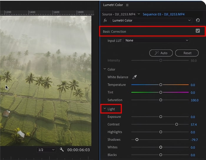 שלב 4.עבור אל "תיקון בסיסי" והתאם את ה"צללים" ו"ניגודיות" בקטע "אור". זה ישחזר חלק מהצבע האבוד של הסרטון.