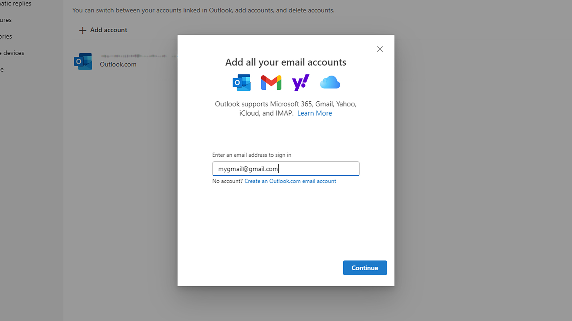 - לִבחוֹרהוסף חשבון, ולאחר מכן הזן את כתובת הדוא"ל שלך ב-Gmail.