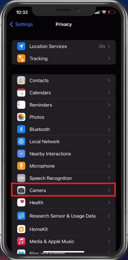 ב-פְּרָטִיוּתמקטע, הקש עלמַצלֵמָהוודא שאינסטגרם מופעל ברשימה זו. זה יאפשר שלךאינסטגרםאפליקציה כדי להשתמש במצלמת האייפון שלך בפעם הבאה שתפתח את האפליקציה.