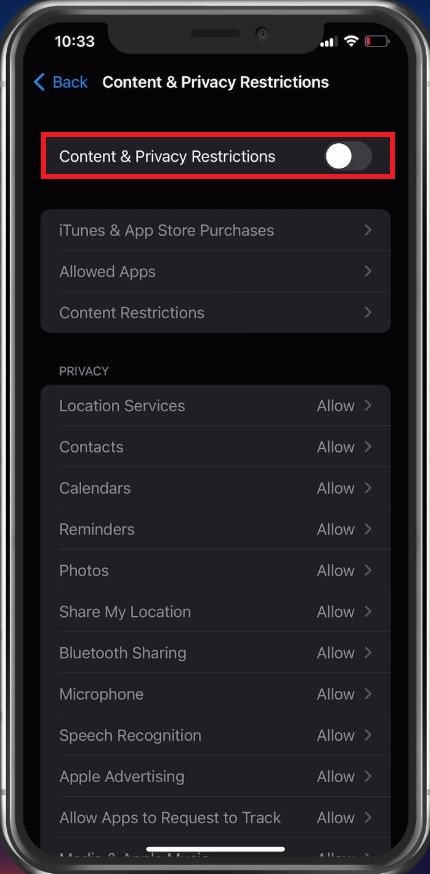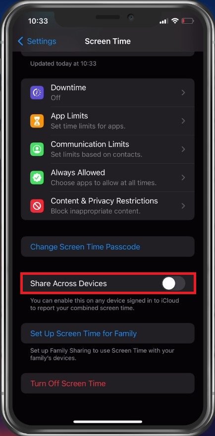 הקפד להשבית לחלוטיןהגבלות תוכן ופרטיותבאמצעות קוד הגישה שלך ולאחר מכן השבת אתשיתוף בין מכשיריםאוֹפְּצִיָה. זה יבטיח ששינויים בהגדרות אלה לא יחולו על מכשירים משפחתיים או מכשירים דומים המחוברים ל-Apple ID שלך.
