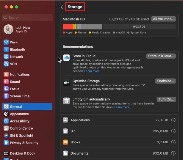 בחזרה להגדרות הכלליות שלך, לחץ עלאִחסוּן. ודא שנשאר לך שטח אחסון פנוי, מכיוון שמשחקים כמו Roblox יקראו ויכתבו קבצים ברקע כדי שיפעלו כהלכה. אתה יכול להתחיל על ידי ריקון הפח שלך ומחיקת קבצים מיותרים אחרים.