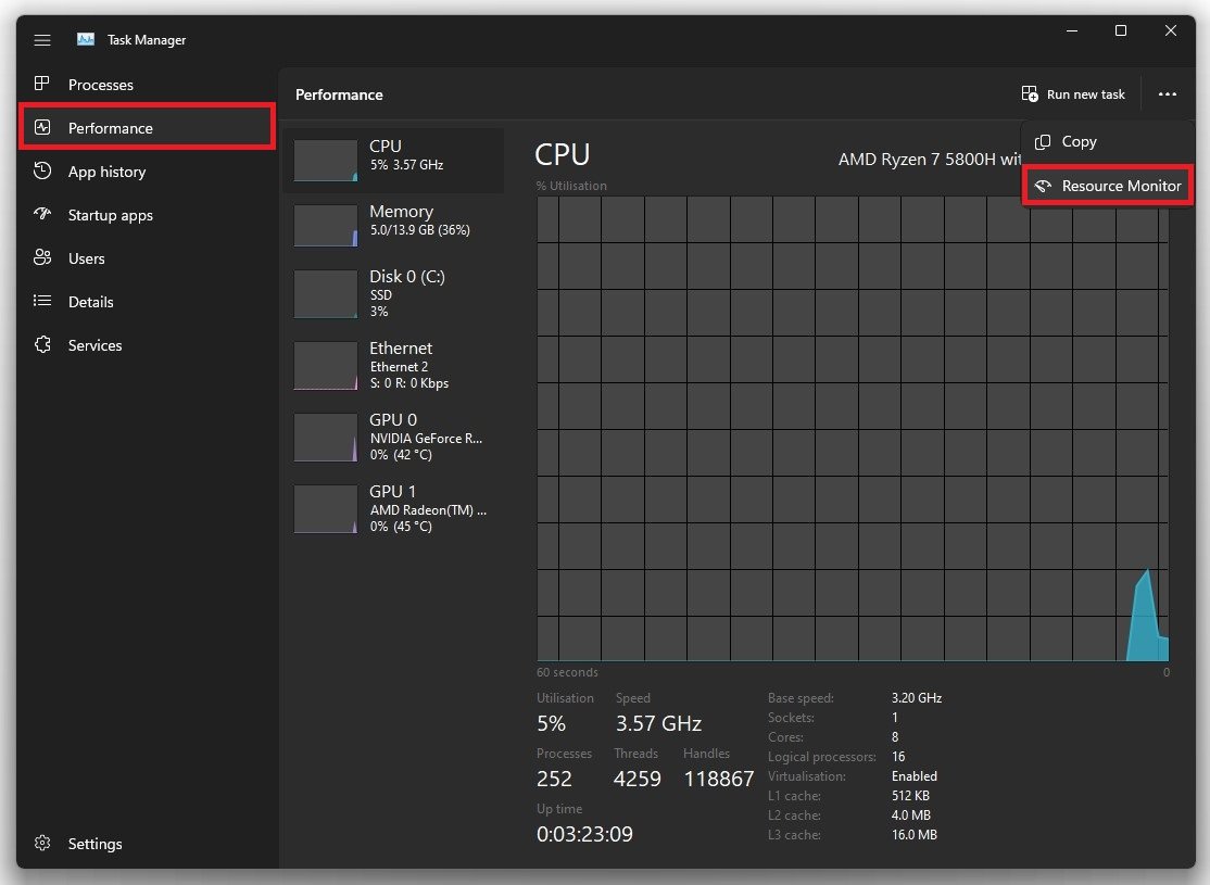 בזמן שאתה מנסה להוריד מחדש את Valorant או עדכון, עליך למנוע מתהליכים עתירי רשת לפעול על המערכת שלך. פתח את מנהל המשימות שלך על ידי חיפוש אותו בתפריט ההתחלה שלך. ב-ביצועיםלשונית, הקפד לפתוח אתמוניטור משאבים. זה יהיה ממוקם בחלק התחתון של חלון מנהל המשימות שלך ב-Windows 10.