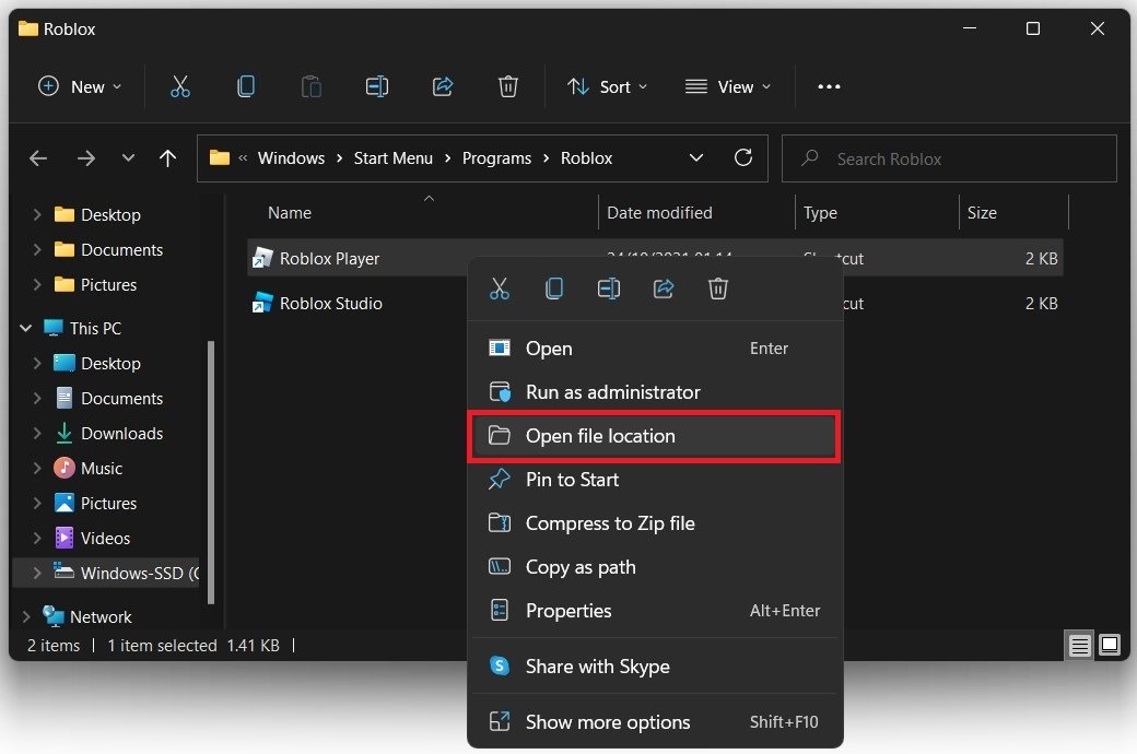 לאחר מתן שמות נכונה לכל חמשת הסמנים שלך, חפש את Roblox בשורת המשימות שלך או התחל את החיפוש בתפריט. לחץ לחיצה ימנית על נגן Roblox ובחרפתח את מיקום הקובץ. תיפתח תיקיה חדשה, שבה תצטרך ללחוץ לחיצה ימנית על אפליקציית Roblox Player שוב ולבחורפתח את מיקום הקובץ.