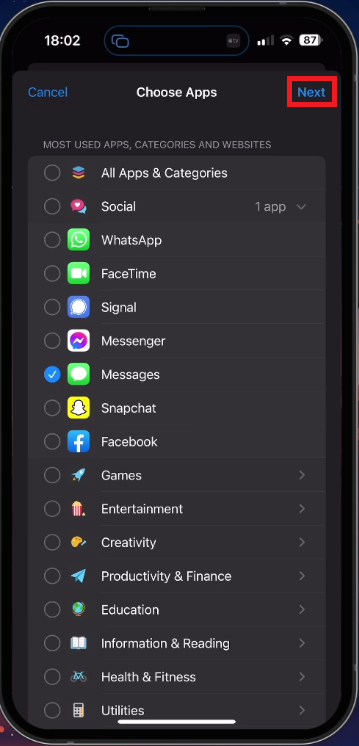 כשאתה מחפש את אפליקציית ההודעות, הרחב את האפליקציות החברתיות שלך ובצע את הבחירה שלך. הקש על הבא והגדר את מגבלת הזמן שלך לדקה אחת ובחר הוסף.