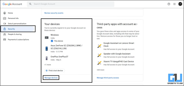 שלב 2:עבור ללשונית אבטחה> חפש את האפשרות "שֶׁלְךָ מכשירים.”> אפשרות זו מציגה את המכשירים שחשבון Google שלך משתמש בו כעת> לחץ על האפשרות “לְנַהֵל מכשירים.”