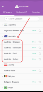- בחר אחד מהשרתים האוסטרליים של PrivateVPN.אתה יכול לבחור את השרת שמציג הכי פחות פינג.