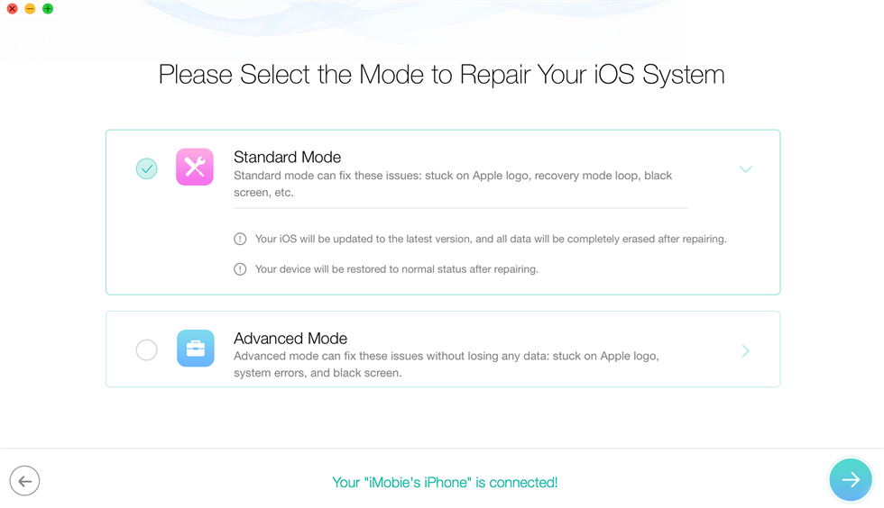 שלב 3. חבר את האייפון שלך למחשב ובחר במצב הסטנדרטי ולחץ על הלחצן הבא כדי להמשיך.