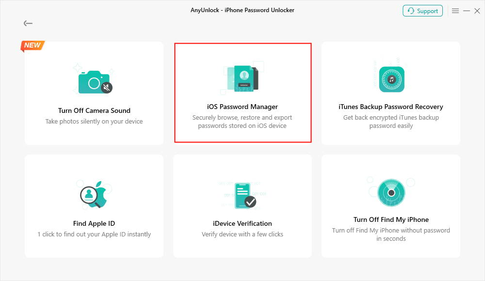 שלב 1. הורד את AnyUnlock והפעל אותו במחשב שלך > חבר את האייפון שלך למחשב > לחץ על כפתור "מנהל הסיסמאות של iOS".