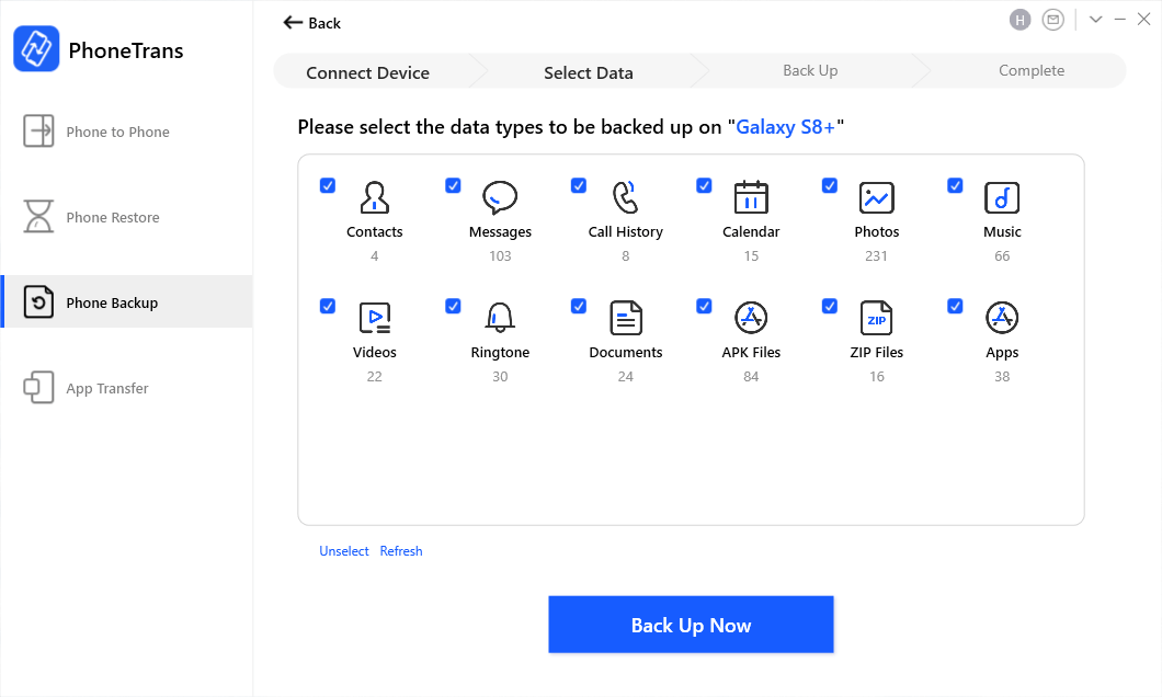 שלב 2. הצג ולחץ על סוגי הנתונים שברצונך לגבות מטלפון Android שלך > לחץ עלגבה עכשיוכדי להתחיל את התהליך.