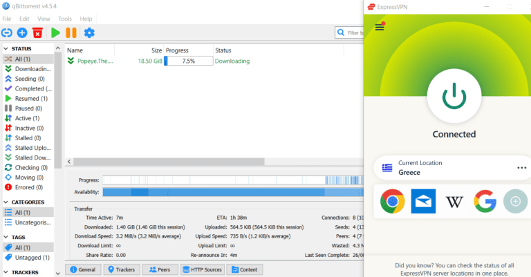 עבור מבחני טורנט, השתמשתי ב-שרת ExpressVPN יווניכאשר בחירת הפרוטוקול האוטומטית מופעלת. באמצעות qBitTorrent, הורדתי את 18GB "פופאי המלח פוגש את סינדבאד המלח" ב1.5 שעות, במהירות הורדה ממוצעת של3.2 MiB/שנייה.
