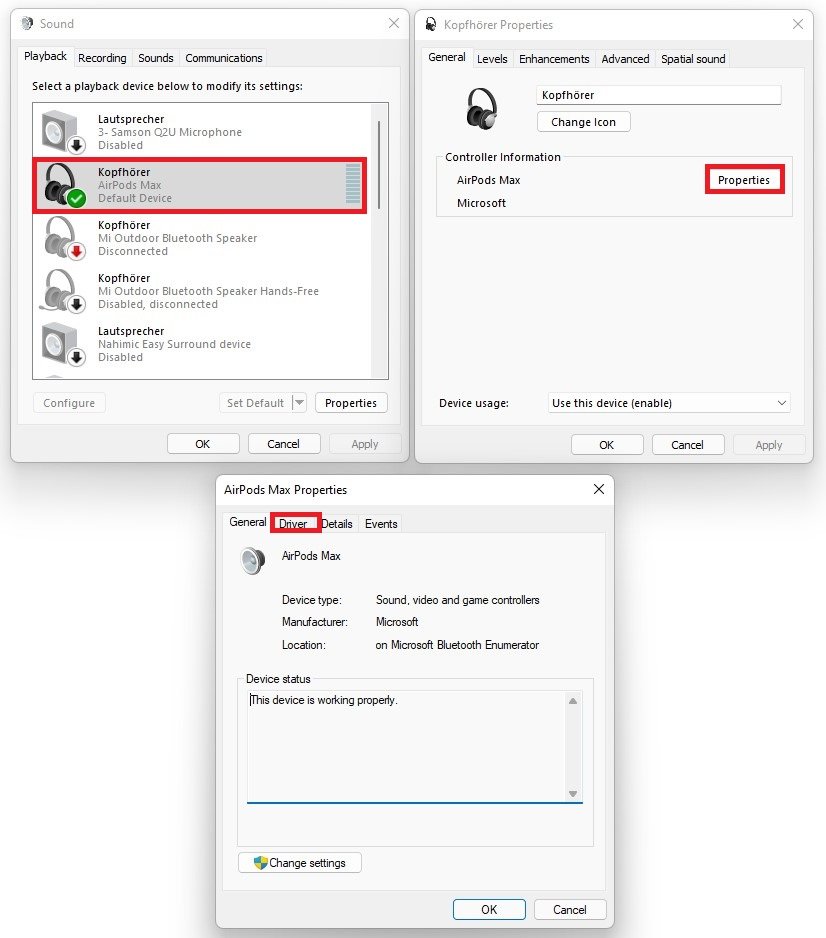 לחץ לחיצה ימנית על מכשיר השמע שלך ובחרנכסים. בחלון זה, לחץ עלנכסיםאצלךכְּלָלִיסָעִיף. ב-נֶהָגלשונית של חלון זה, בחרעדכן דרייבר. אם אפשרות זו מופיעה באפור, מנהל ההתקן של המכשיר אמור להיות מעודכן.