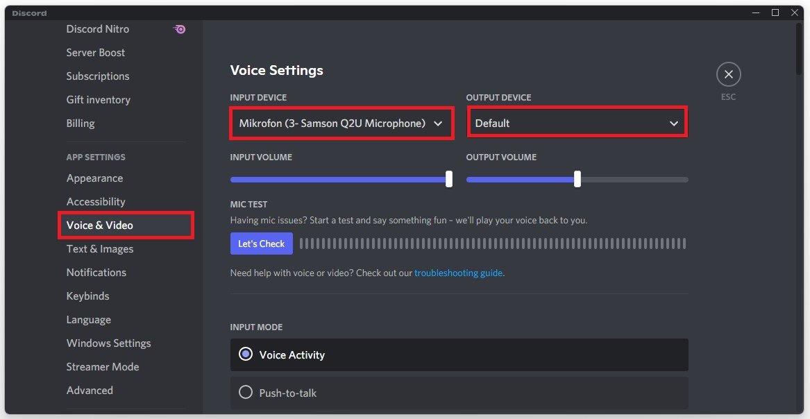הגדרות משתמש Discord > קול ווידאו > הגדרות קול