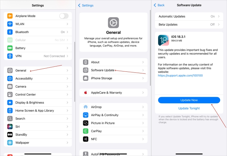 Een andere optie om dit probleem op te lossen, is controleren op iPhone-updates. Zorg ervoor dat uw iPhone is bijgewerkt naar de nieuwste versie van iOS. Soms resulteert de iOS-versie in dit probleem. Voer de volgende stappen uit om iOS op uw iPhone te controleren en bij te werken.