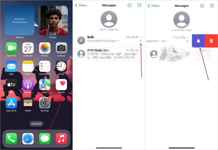 Stap 3.Veeg het bericht naar links en tik op het belpictogram om de stille melding voor dit contact uit te schakelen.