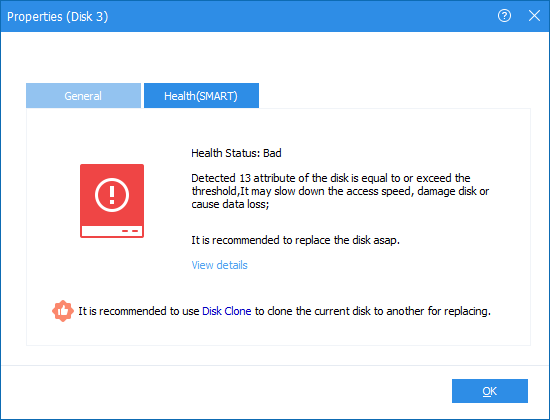 Deze situatie betekent dat een of meer attributen gelijk zijn aan of kleiner zijn dan de drempelwaarde. De schijf kan snel beschadigd raken en gegevensverlies veroorzaken. Het wordt aanbevolen om deze zo snel mogelijk te vervangen door een nieuwe.