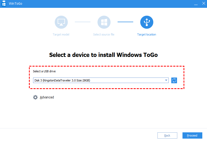 Stap 2.Kies de juiste USB-drive onder “USB-opstartapparaat' en klik op 'Doorgaan”.