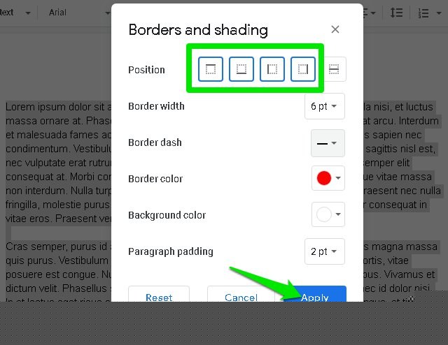 Google heeft misschien niet de mogelijkheid om een rand over de volledige pagina toe te voegen, maar u kunt nog steeds een rand aan een alinea toevoegen. U kunt dezelfde optie gebruiken om een rand rond de gehele inhoud van uw document toe te voegen. Zo gaat het: