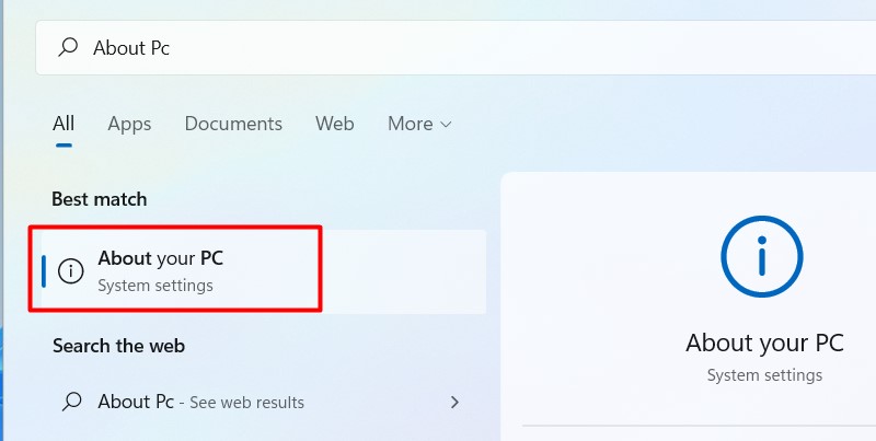 Stap 2: zoek rechtstreeks naar over pc of typ “over PC' in de zoekbalk.