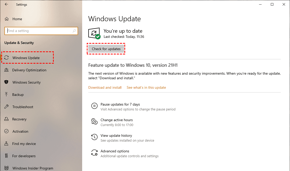Stap 2. Ga naar het tabblad Windows Update en klik op “Controleren op updates” in het rechtervenster.