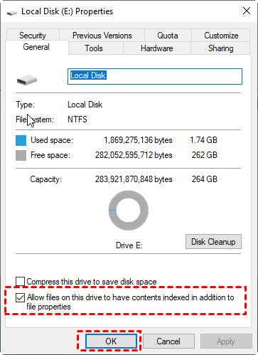 Stap 2. Navigeer naar het tabblad “Algemeen”. Schakel de optie uit die zegt: "Sta toe dat de inhoud van bestanden op dit station wordt geïndexeerd naast de bestandseigenschappen". Klik op Toepassen.