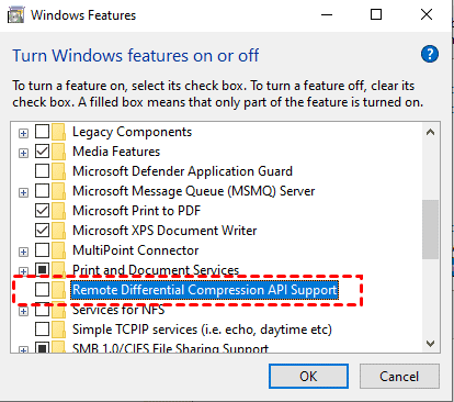 Stap 2. Zoek het vakje voor 'Remote Differential Compression API support' en schakel het uit. Klik op OK om de instellingen op te slaan.