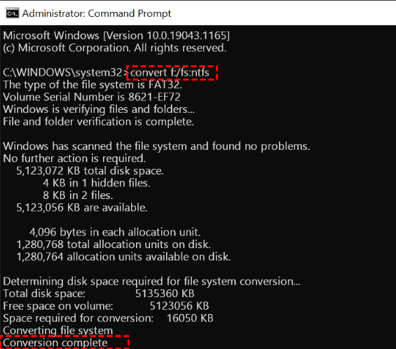 Wacht tot het proces is voltooid. Zodra u 'Conversie voltooid' ziet, is het USB-station succesvol geformatteerd naar het NTFS-bestandssysteem.