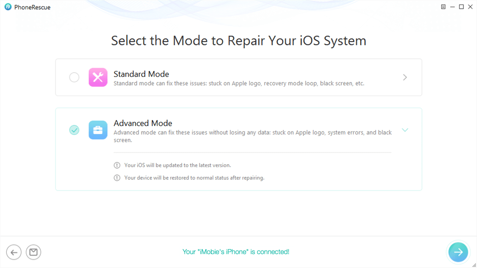 Stap 2. Hier zijn twee reparatiemodi waaruit u kunt kiezen. Met de Geavanceerde modus kunt u de iPhone herstellen zonder gegevensverlies. Als je je iPhone ook wilt resetten naar de fabrieksinstellingen, kun je kiezen voor Standaardmodus.
