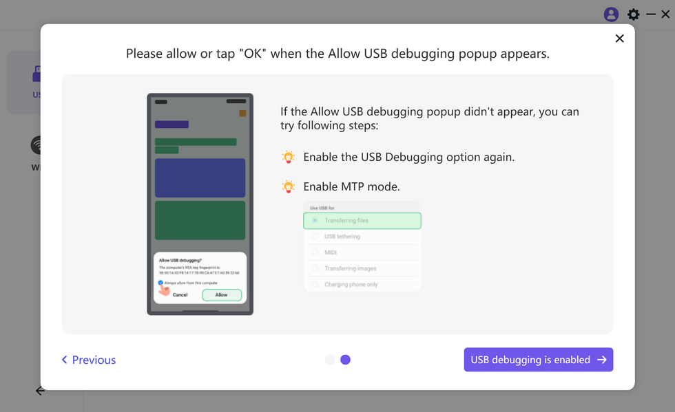 Stap 4.Schakel vervolgens USB-foutopsporing in en kies de MTP-modus.
