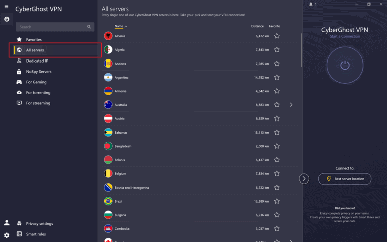 - Als u klaar bent, klikt u op “Alle servers' in het linkerdeelvenster om de lijst met beschikbare servers te bekijken waarmee u verbinding kunt maken.