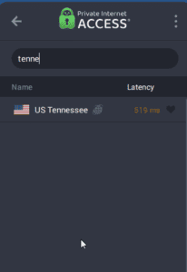 - Open de PIA-serverlijst om naar een voorkeursserver te zoeken. U kunt ook op de klikkengrote aan/uit-knopom verbinding te maken met de dichtstbijzijnde/snelste server. Voor dit voorbeeld zoek ik naar de Amerikaanse Tennessee-server.