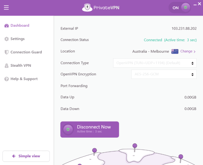 - Controleer of de verbinding met PrivateVPN is verbroken: Start de VPN opnieuw om te bevestigen dat u nog steeds niet bent verbonden met een server. Dat komt omdat het afsluiten van de VPN niet altijd betekent dat deze is uitgeschakeld en mogelijk nog steeds op de achtergrond actief is.