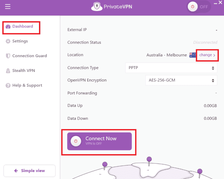 - Maak verbinding met een PrivateVPN-server. Voor dit voorbeeld gebruik ik de Australische server.