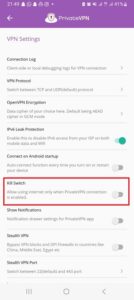 Android-gebruikers kunnen er ook voor kiezen om de PrivateVPN-kill-schakelaar in of uit te schakelen.