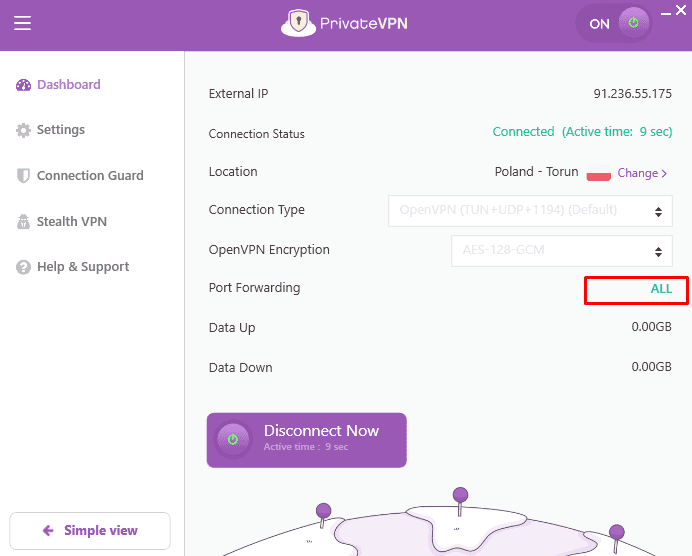 Zoals eerder vermeld, kiest u voor dynamische port forwarding voor maximale anonimiteit. De dynamische port forwarding van PrivateVPN staat alle poorten toe, waardoor het moeilijker wordt voor copyright-trollen om uw IP te achterhalen.