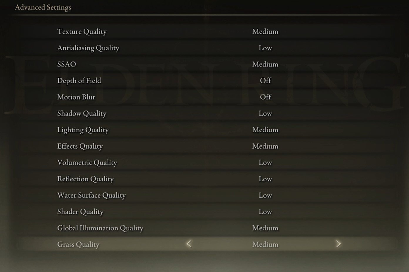 Verklein uwSchaduwkwaliteitnaarLaag,VerlichtingskwaliteitnaarMedium,Effecten KwaliteitnaarMedium,Volumetrische kwaliteitnaarLaag,Reflectie kwaliteitnaarLaag, EnKwaliteit van het wateroppervlakEnShader-kwaliteit. Stel ten slotte deWereldwijde verlichtingskwaliteitEnGraskwaliteitinstellingen aanMedium.