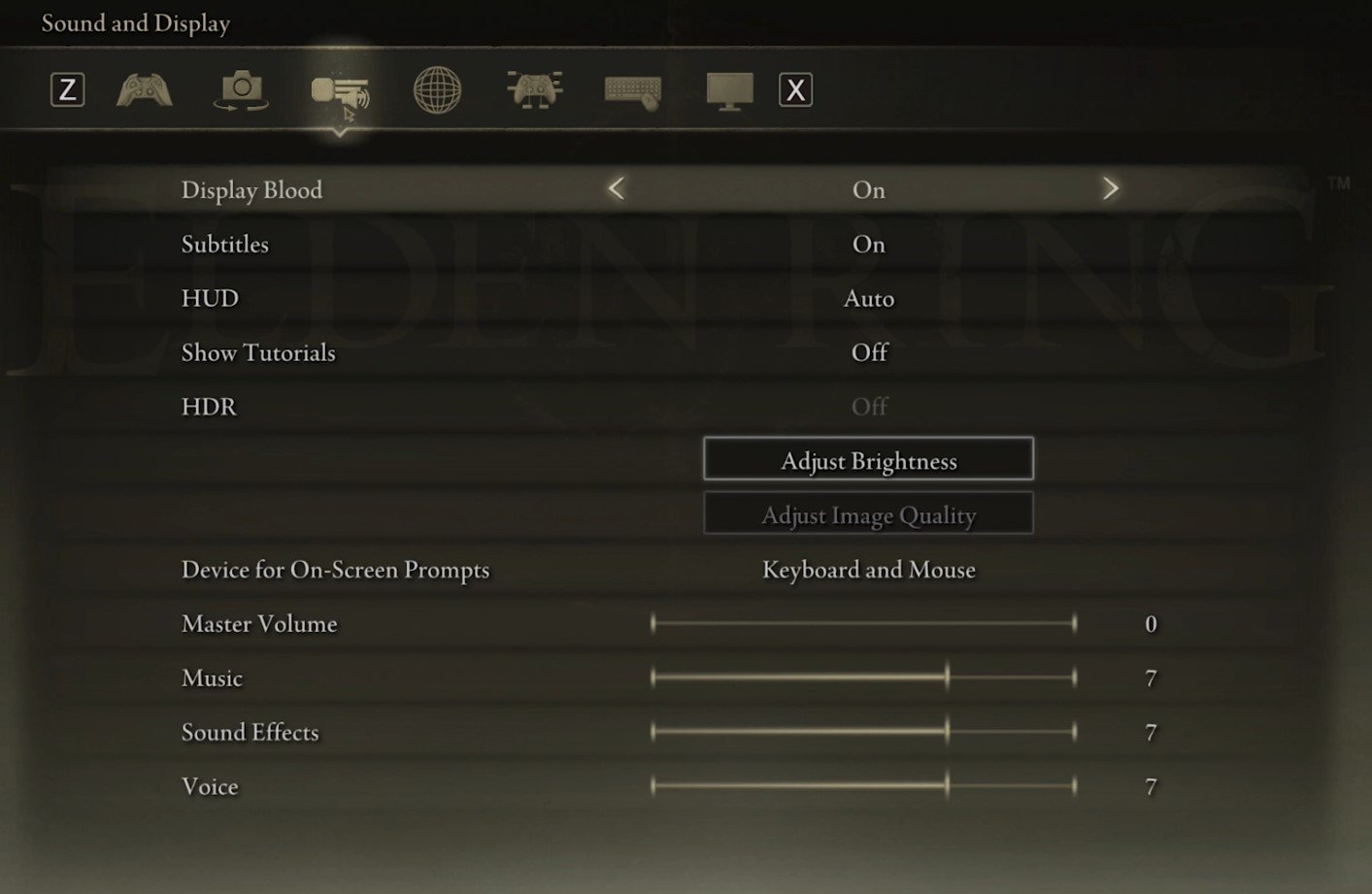Misschien wilt u deBloed weergevenoptie in deGeluid en weergaveinstellingen, die standaard zijn ingeschakeld. Bij het instellen van deHUDoptie omAuto, zal de game je heads-up-display weergeven wanneer dat nodig is, en anders van je scherm verwijderen. Hieronder heeft u de mogelijkheid om de helderheid van uw scherm aan te passen. Dit heeft geen invloed op de prestaties van het spel. Wijzig uw apparaat voor aanwijzingen op het scherm in Toetsenbord en muis wanneer u een toetsenbord en muis gebruikt.