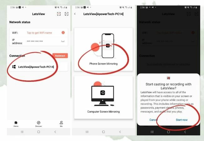 - Start de app en tik op de naam op uw pc > Kies Phone ScreenMirroring > Nu starten.