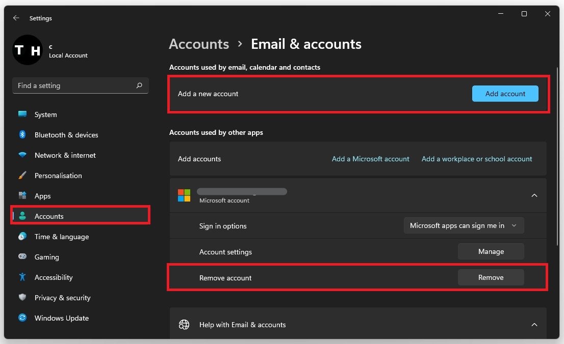 Als de vorige stap uw probleem niet heeft opgelost, navigeert u naar deRekeningentabblad in uw instellingen. OnderE-mail en accounts, verwijder uw huidige Microsoft-account en voeg het opnieuw toe als een nieuw account in dit venster.