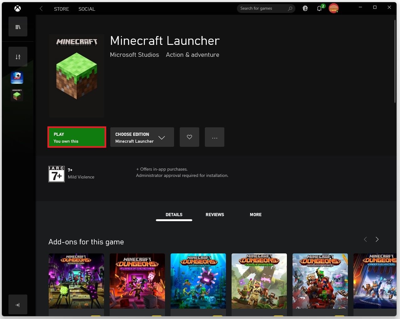 Open uwXbox-app. Zorg ervoor dat u bent ingelogd met uwMicrosoft-account. Als alternatief kunt u gebruik maken van deMicrosoft-winkelapp op Windows 10 of 11. Nadat u bent ingelogd met uw account, zoekt u naarMinecraft. Hiermee kun je Minecraft downloaden en installeren.