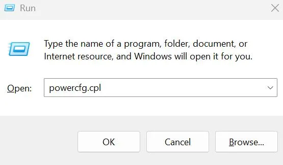 - Druk op Win + R om het RUN-vak te openen en typ powercfg.cpl gevolgd door de knop OK.